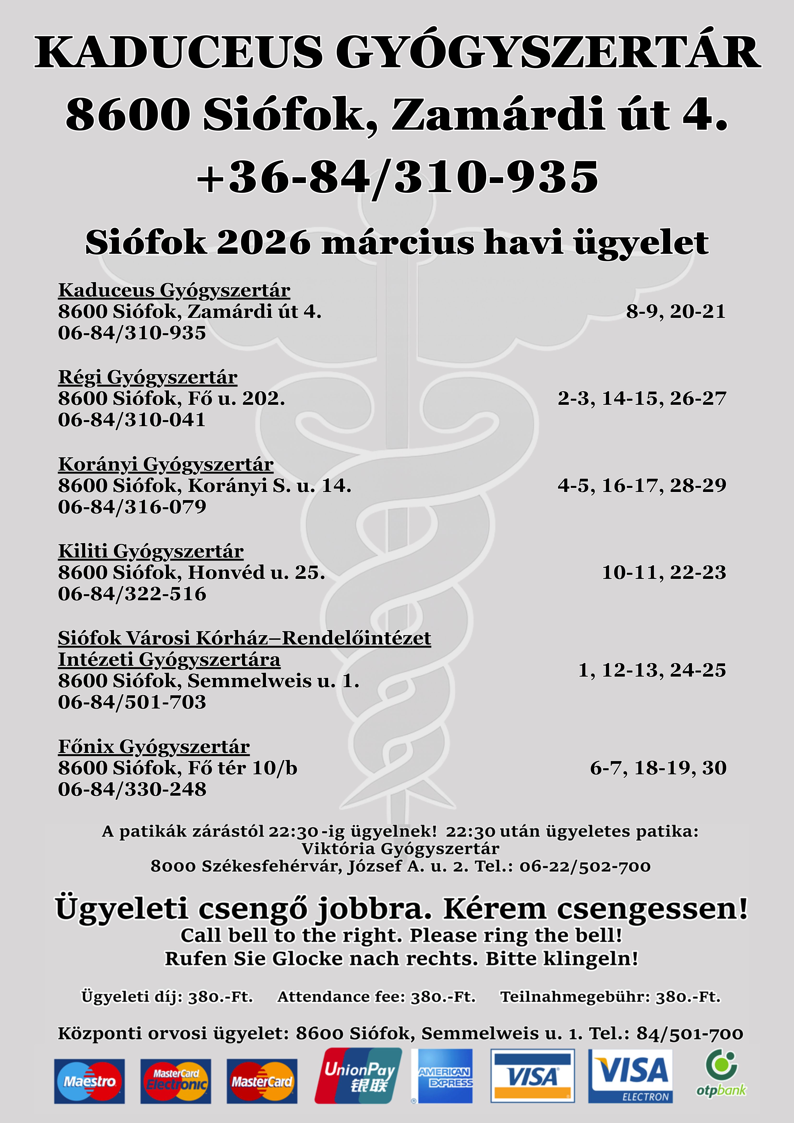 Siófok az a város ahol minden nap más patika ügyel, ezért érdemes figyelni a kiírásokat! Átlagosan 10 naponta esik egy patikára az ügyelet, ami két napig tart. Az ügyelet kezdete attól függ, hogy az éppen aktuális ügyelő patika meddig van nyitva. A vége egységes 22.00-ig tart. Ez alól kivétel a nyári időszak (június 01-től -augusztus 31-ig) amikor a patikák egész éjszaka ügyelnek. Előző nap zárástól, másnapi nyitásig.