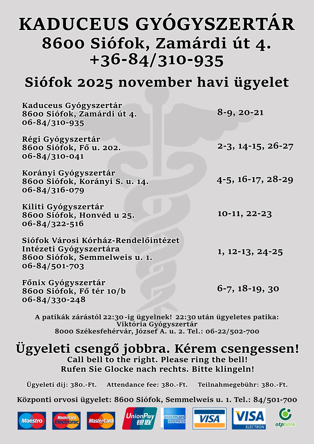 Siófok az a város ahol minden nap más patika ügyel, ezért érdemes figyelni a kiírásokat! Átlagosan 10 naponta esik egy patikára az ügyelet, ami két napig tart. Az ügyelet kezdete attól függ, hogy az éppen aktuális ügyelő patika meddig van nyitva. A vége egységes 22.00-ig tart. Ez alól kivétel a nyári időszak (június 01-től -augusztus 31-ig) amikor a patikák egész éjszaka ügyelnek. Előző nap zárástól, másnapi nyitásig.